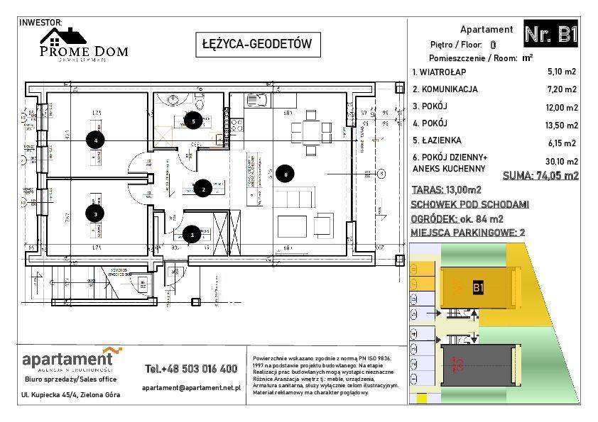 Promocja! Bezczynszowy 3 pokojowy apartament z ogródkiem oraz z dwoma miejscami postojowymi Czarkowo - Łężyca ! WIĘCEJ INFORMACJI pod numerem telefonu -503 016 400 Pomagamy w wyborze korzystnej oferty bankowej oraz w formalnościach związanych z uzyskaniem kredytu. Apartamenty Geodetów ,Nowa inwestycja deweloperska w Zielonej Górze. ,Brak podatku PCC 0%-Kupujący nie płaci prowizji 75,35 m - salon z otwartą kuchnią + 2 sypialnie + komórka ogródek dwa prywatne miejsca postojowe stan deweloperski premium - ogrzewanie podłogowe w całym budynku, w salonie klimatyzacja w oknach rolety elektryczne najwyższe standardy norm cieplnych loftowy design nowoczesne osiedle z rozwiniętą infrastrukturą piękna lokalizacja w otoczeniu lasów i terenów rekreacyjnych brak opłat czynszowych bez podatku pcc Do apartamentu przynależą dwa miejsca postojowe oraz , prywatny , , ogródek o pow. 147 mkw Lokal nr A1 z ogrodem - , ,cena 680 000 zł - , REZERWACJA Lokal nr A2 z tarasem - dostępny cena 640 000 zł Lokal nr B1 z ogrodem - dostępny cena 665 000 zł Lokal nr B2 z tarasem - dostępny cena 627 000 zł Nowa inwestycja - `Apartamenty Geodetów`- jest położona w malowniczej okolicy Zielonej Góry: najnowsze miejskie--Osiedle Czarkowo-Łężyca--w otoczeniu jedynie nowych budynków -doskonale skomunikowanej z centrum miasta. Układ pomieszczeń Przestronny komfortowy salon połączony z kuchnią - o pow. 30,10 mkw - z szeroko rozsuwanymi drzwi prowadzącymi na zadaszony ,taras i ogródek. Dwie duże sypialnie 13,5 mkw i 12 mkw posiadają okna do samej podłogi. W łazience o pow. 6,15 mkw zaprojektowane zostało miejsce na umywalkę, niezależną toaletę oraz dużą kabinę prysznicową. Otwarte przestrzenie, duże przeszklenia i wysokie sufity. Apartament jest zaprojektowany w wyjątkowym loftowym designie. Wszystkie okna wykonane zostały w formie balkonów francuskich. We wszystkich pomieszczeniach sufity zostały podwyższone. W centrum miasta wśród zieleni Budynek znajduje się w świetnej lokalizacji w najbliższej odległości do centrum miasta a zarazem wśród lasów i zieleni na nowym osiedlu z rozwiniętą infrastrukturą. Dzięki doskonałemu połączeniu dojazd do oddalonego zaledwie o 3 km centrum miasta zajmuje w godzinach szczytu niecałe 5 minut. W najbliższej odległości znajdują się duże sklepy sieciowe, przystanek autobusowy oraz liczne punkty usługowe. Standard wykończenia: ,Budynki sprzedawane w stanie deweloperskim. Bardzo wysoka jakość wykończenia budynków. Duże okna zastosowane w budynku dostarczają ogromną ilość światła dziennego. Ogrzewanie podłogowe. Okna PCV 3 szybowe. Rolety sterowane elektrycznie. W budynku rozprowadzone wszystkie instalacje. Elewacja to tynk cienkowarstwowy, parapety wewnętrzne konglomerat. Drzwi zewnętrzne antywłamaniowe. Zagospodarowany terenu wokół budynku: ,wjazd i podejście do budynków oraz miejsca parkingowe z kostki polbruk, ogrodzenie działki. Media:woda, kanalizacja, prąd, gaz LOKALIZACJA: ,Osiedle Czarkowo, Łężyca -Zielona Góra - dom usytuowany na nowym dynamicznie rozwijającym się osiedlu. Idealne usytuowanie pod względem dojazdu do centrum Zielonej Góry. Bardzo dobra lokalizacja, dużo terenów zielonych, las. WALORY DOMU: 1. Komfortowe niepowtarzalne mieszkanie . 2. Nowoczesna odważna architektura. 3. Bardzo atrakcyjna lokalizacja . 4. Tereny rekreacyjne, szybki dojazd do centrum zielonej góry - ok. 10 minut samochodem . Agent prowadzący: Bogdan Dranczewski tel. 503 016 400 bogdan.dranczewski@apartament.net.pl Zlecenie realizowane pod nadzorem pośrednika, nr licencji 1717. Poniższa oferta ma charakter informacyjny, nie stanowi oferty handlowej w rozumieniu art. 66 1 kodeksu cywilnego oraz innych właściwych przepisów prawnych. Apartament Nieruchomości od 1999 roku specjalizuje się w sprzedaży i wynajmie domów, mieszkań oraz działek na terenie Zielonej Góry i okolic. Profesjonalnie przeprowadzamy transakcje, regulujemy stan prawny nieruchomości oraz pomagamy w uzyskaniu kredytów. Zlecenia realizujemy pod nadzorem licencjonowanego pośrednika nr licencji 1717. Poniższa oferta ma charakter informacyjny i nie stanowi oferty w rozumieniu art. 66(1) kodeksu cywilnego. Wizualizacja ma charakter poglądowy. Zapraszamy do kontaktu i obejrzenia tego wyjątkowego osiedla!