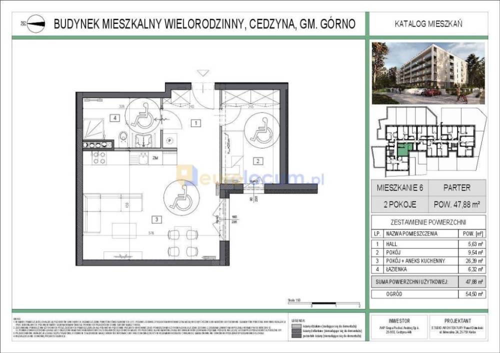 MIESZKANIE , Z TARASEM!!! Oferuję do sprzedaży mieszkanie o pow. 47,88 mkw usytuowane na parterze w budynku IV piętrowym z windą. Lokal składa się z pokoju dziennego połączonego z kuchnią, sypialni , oraz łazienki z wc, taras naziemny o pow.54,50 mkw. Mieszkanie w stanie deweloperskim - do własnej aranżacji. Miejsce postojowe w hali garażowej: 60.000 zł/ na platformie 40.000 zł. Komórka lokatorska: pow. od 2,47 do 7,70 mkw - 6000 zł/mkw. Planowany termin ukończenia budowy, to lipiec 2026 roku. Leśne Apartamenty Cedzyna etap III, to 4-piętrowy, wielorodzinny, nowoczesny budynek z mieszkaniami o funkcjonalnym układzie od 26 m2 do 83 m2 z balkonami i dużymi tarasami. W części podziemnej budynku zaprojektowano garaż wielostanowiskowy z miejscami postojowymi oraz komórkami lokatorskimi. Dla wygody i komfortu mieszkańców budynek będzie wyposażony w cichobieżne windy, które będą dostępne z poziomu garażu. Nieruchomość zlokalizowana w cichym i spokojnym miejscu, w otoczeniu lasu sosnowego, w odległości ok 100m od zalewu cedzyńskiego a zarazem z szybkim i dogodnym dostępem do centrum Kielc. Podana cena jest ceną dewelopera. Kupując mieszkanie z nasza pomocą otrzymasz od nas `Pakiet Korzyści` który pozwoli Ci na realne oszczędności przy zakupie materiałów do wykończenia mieszkania i wystroju wnętrza. Otrzymasz także darmową polisę OC. (Szczegóły w zakładce pakiet-korzyści ). ------------------------------------------------------------------------------------ Profesjonalizm naszych usług oparty jest na prawie 40-letnim doświadczeniu i kierunkowym wykształceniu naszej ekipy. Transakcje realizowane są przez licencjonowanych pośredników i doradców, w oparciu o przepisy prawa i znajomość lokalnego rynku. Dodatkowo naszych klientów chroni polisa OC - CONCORDIA (kwota ubezpieczenia 500.000 EUR). Nasi doradcy finansowi wyszukają najlepszy kredyt lub dofinansowanie. Poprzez sieć i kontakty, nasze oferty docierają do największej rzeszy klientów nie tylko w Polsce. Zapraszamy - ekipa EUROLOCUM.PL