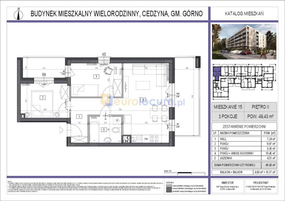 Oferuję do sprzedaży mieszkanie o pow. 49,43 mkw usytuowane na II piętrze w budynku IV piętrowym z windą. Lokal składa się z pokoju dziennego połączonego z kuchnią, 2 sypialni oraz łazienki z wc, balkon Mieszkanie w stanie deweloperskim - do własnej aranżacji. Miejsce postojowe w hali garażowej: 60.000 zł/ na platformie 40.000 zł. Komórka lokatorska: pow. od 2,47 do 7,70 mkw - 6000 zł/mkw. Planowany termin ukończenia budowy, to lipiec 2026 roku. Leśne Apartamenty Cedzyna etap III, to 4-piętrowy, wielorodzinny, nowoczesny budynek z mieszkaniami o funkcjonalnym układzie od 26 m2 do 83 m2 z balkonami i dużymi tarasami. W części podziemnej budynku zaprojektowano garaż wielostanowiskowy z miejscami postojowymi oraz komórkami lokatorskimi. Dla wygody i komfortu mieszkańców budynek będzie wyposażony w cichobieżne windy, które będą dostępne z poziomu garażu. Nieruchomość zlokalizowana w cichym i spokojnym miejscu, w otoczeniu lasu sosnowego, w odległości ok 100m od zalewu cedzyńskiego a zarazem z szybkim i dogodnym dostępem do centrum Kielc. Podana cena jest ceną dewelopera. Kupując mieszkanie z nasza pomocą otrzymasz od nas `Pakiet Korzyści` który pozwoli Ci na realne oszczędności przy zakupie materiałów do wykończenia mieszkania i wystroju wnętrza. Otrzymasz także darmową polisę OC. (Szczegóły w zakładce pakiet-korzyści ). ------------------------------------------------------------------------------------ Profesjonalizm naszych usług oparty jest na prawie 40-letnim doświadczeniu i kierunkowym wykształceniu naszej ekipy. Transakcje realizowane są przez licencjonowanych pośredników i doradców, w oparciu o przepisy prawa i znajomość lokalnego rynku. Dodatkowo naszych klientów chroni polisa OC - CONCORDIA (kwota ubezpieczenia 500.000 EUR). Nasi doradcy finansowi wyszukają najlepszy kredyt lub dofinansowanie. Poprzez sieć i kontakty, nasze oferty docierają do największej rzeszy klientów nie tylko w Polsce. Zapraszamy - ekipa EUROLOCUM.PL