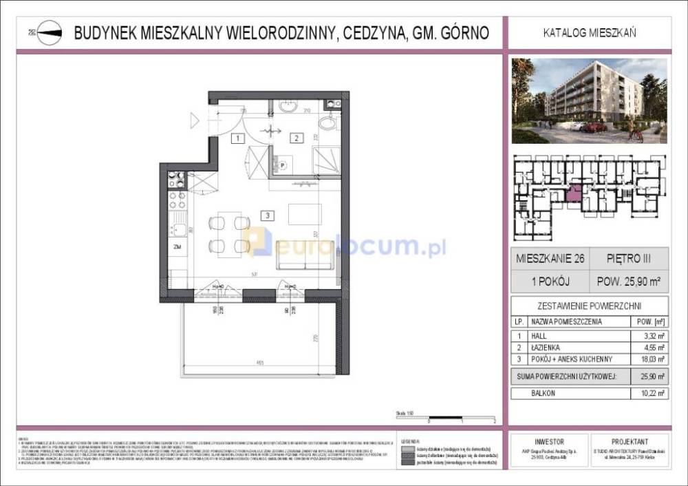 Oferuję do sprzedaży mieszkanie o pow. 25,90 mkw usytuowane na III piętrze w budynku IV piętrowym z windą. Lokal składa się z pokoju dziennego połączonego z kuchnią oraz łazienki z wc, balkon. Mieszkanie w stanie deweloperskim - do własnej aranżacji. Miejsce postojowe w hali garażowej: 60.000 zł/ na platformie 40.000 zł. Komórka lokatorska: pow. od 2,47 do 7,70 mkw - 6000 zł/mkw. Planowany termin ukończenia budowy, to lipiec 2026 roku. Leśne Apartamenty Cedzyna etap III, to 4-piętrowy, wielorodzinny, nowoczesny budynek z mieszkaniami o funkcjonalnym układzie od 26 m2 do 83 m2 z balkonami i dużymi tarasami. W części podziemnej budynku zaprojektowano garaż wielostanowiskowy z miejscami postojowymi oraz komórkami lokatorskimi. Dla wygody i komfortu mieszkańców budynek będzie wyposażony w cichobieżne windy, które będą dostępne z poziomu garażu. Nieruchomość zlokalizowana w cichym i spokojnym miejscu, w otoczeniu lasu sosnowego, w odległości ok 100m od zalewu cedzyńskiego a zarazem z szybkim i dogodnym dostępem do centrum Kielc. Podana cena jest ceną dewelopera. Kupując mieszkanie z nasza pomocą otrzymasz od nas `Pakiet Korzyści` który pozwoli Ci na realne oszczędności przy zakupie materiałów do wykończenia mieszkania i wystroju wnętrza. Otrzymasz także darmową polisę OC. (Szczegóły w zakładce pakiet-korzyści ). ------------------------------------------------------------------------------------ Profesjonalizm naszych usług oparty jest na prawie 40-letnim doświadczeniu i kierunkowym wykształceniu naszej ekipy. Transakcje realizowane są przez licencjonowanych pośredników i doradców, w oparciu o przepisy prawa i znajomość lokalnego rynku. Dodatkowo naszych klientów chroni polisa OC - CONCORDIA (kwota ubezpieczenia 500.000 EUR). Nasi doradcy finansowi wyszukają najlepszy kredyt lub dofinansowanie. Poprzez sieć i kontakty, nasze oferty docierają do największej rzeszy klientów nie tylko w Polsce. Zapraszamy - ekipa EUROLOCUM.PL