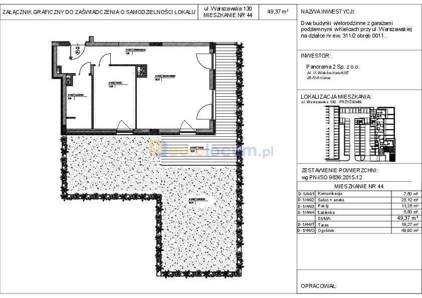 MIESZKANIE Z TARASEM I OGRÓDKIEM!!! Przedstawiam ofertę sprzedaży mieszkania o pow. 49,37 m, zlokalizowanego na parterze nowego budynku z windą. Lokal posiada jeden z najlepszych układów w bloku - pomieszczenia są funkcjonalne, ustawne i zapewniają wygodną aranżację przestrzeni. Układ pomieszczeń:salon z aneksem kuchennym, sypialnia, łazienka z WC, przedpokój. Dodatkowym atutem nieruchomości jest taras o powierzchni 18,27 m oraz prywatny ogródek , o pow. 49,90 m, idealny do wypoczynku i spędzania czasu na świeżym powietrzu. Atuty mieszkania:stan deweloperski - do własnej aranżacji, komórka lokatorska ,- 11.500 zł miejsce postojowe w hali garażowej - 45.000 zł nowoczesny budynek z windą, bardzo dobra dostępność komunikacyjna szybki dojazd do centrum i innych części miasta, doskonała lokalizacja: blisko centrum, uczelni, sklepów i terenów zielonych. Mieszkanie jest idealne zarówno dla osób szukających własnego komfortowego lokum, jak i pod inwestycję. Wynagrodzenie za usługę biura pokrywa wyłącznie sprzedający. ------------------------------------------------------------------------------------------ Profesjonalizm naszych usług oparty jest na 40-letnim doświadczeniu i kierunkowym wykształceniu naszej ekipy. Transakcje realizowane są przez licencjonowanych pośredników i doradców, w oparciu o przepisy prawa i znajomość lokalnego rynku. Dodatkowo naszych klientów chroni polisa OC - GENERALI (kwota ubezpieczenia 500.000 EUR). Nasi doradcy finansowi wyszukają najlepszy kredyt lub dofinansowanie. Poprzez sieć i kontakty, nasze oferty docierają do największej rzeszy klientów nie tylko w Polsce. Zapraszamy - ekipa EUROLOCUM.PL