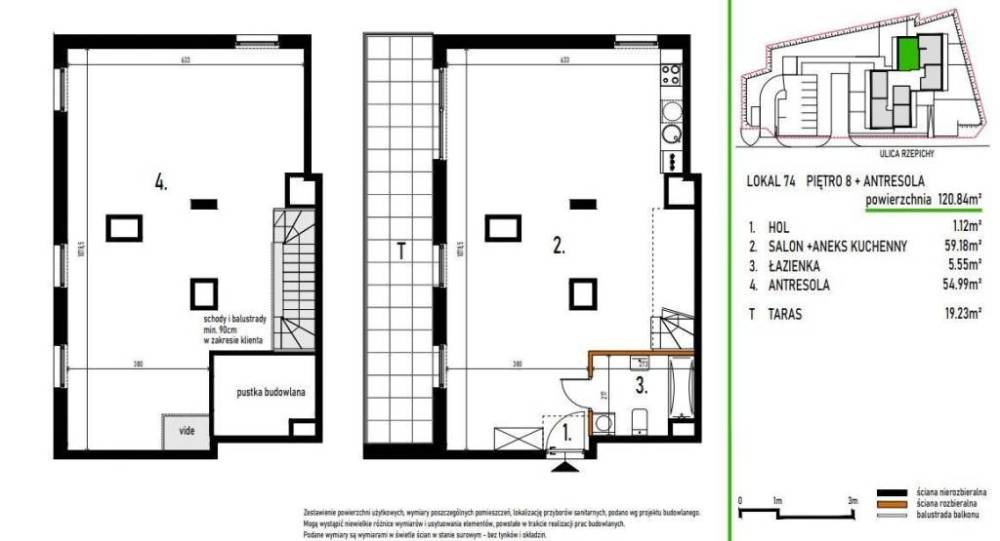 Nowoczesnemieszkanie z antresolą 120,99 m i tarasem 19,23 m - 8. piętro- Targówek, ul. Rzepichy. Cena: 1 604 448 zł Bezpośrednio od dewelopera. Na sprzedaż wyjątkowe mieszkanie z antresolą o łącznejpowierzchni 120,99 m oraz przestronnymtarasem o powierzchni 19,23 m, zlokalizowane na ostatnim,8. piętrze nowoczesnego budynku z windą przy ul. Rzepichy nawarszawskim Targówku. To idealna propozycja dla osóbszukających przestrzeni z potencjałem aranżacyjnym - wysokiesufity, otwarta przestrzeń i antresola tworzą niepowtarzalny klimatmiejskiego loftu, a taras staje się naturalnym przedłużeniemstrefy dziennej - idealnym na relaks czy spotkania przy kawie. , Inwestycja: Nowoczesna inwestycja powstająca na Targówku to idealnapropozycja dla osób szukających wygodnego mieszkania w doskonałejlokalizacji. Starannie zaprojektowany budynek o nowoczesnym wzornictwie toidealne miejsce dla rodzin z dziećmi, singli, młodych małżeństwczy osób starszych. W otoczeniu terenów zielonych i pełnejmiejskiej infrastruktury, mieszkańcy mogą odetchnąć od zgiełkumiasta w kameralnym zakątku starej części dzielnicy. Inwestycja obejmuje 8-piętrowy budynek z 78 mieszkaniami 1-, 2-,3- i 4-pokojowymi o powierzchni od 40 do 130 m, z głębokimibalkonami, przestronnymi tarasami i dużymi ogródkami. Dodyspozycji mieszkańców: - Miejsca postojowe w garażach podziemnych i naziemnych - Boksy rowerowe - Urokliwa strefa rekreacji na patio - Szlachetne materiały wykończeniowe w częściach wspólnych Szczegóły mieszkania: , - Powierzchnia całkowita: 120,99 m - Poziom: 8. piętro (z windą) - Antresola z możliwością dowolnej aranżacji (np. sypialnia, biuro, strefa relaksu) - Taras o powierzchni , 19,23 ,m - z pięknym widokiem i dużą prywatnością - Mieszkanie w stanie deweloperskim - Komórka lokatorska - Miejsce postojowe w garażu podziemnym Lokalizacja - Targówek, ul.Rzepichy: Świetnie skomunikowana lokalizacja z dostępem do pełnejinfrastruktury: , - 3 min pieszo do sklepu osiedlowego i psiego parku - 6 min pieszo do pętli autobusowej - 11 min pieszo do żłobka - 15 min pieszo do szkoły podstawowej i pływalni Polonez - 17 min pieszo do Atrium Targówek - 15 min pieszo do stacji metra - 20 min pieszo do Parku Bródnowskiego i Lasu Bródnowskiego - 5 min autem do trasy S8 - 16 min autem do centrum Warszawy Dlaczego warto? - Przestronny taras 19,23 m z widokiem ponad dachami miasta - Antresola i otwarta przestrzeń dają ogromne możliwości aranżacyjne - Nowoczesna inwestycja w spokojnej części Targówka Posiadamy również inne lokale w tej inwestycji. Zadzwoń i umów się na prezentację! Zamieszkaj nowocześnie, wysoko i wygodnie - z własnym tarasem, antresolą iświetnym dojazdem do centrum! , Kontakt: Marek 509 165 458 Więcej ofert na stronach: kobrynski.pl, www.grewal.com.pl