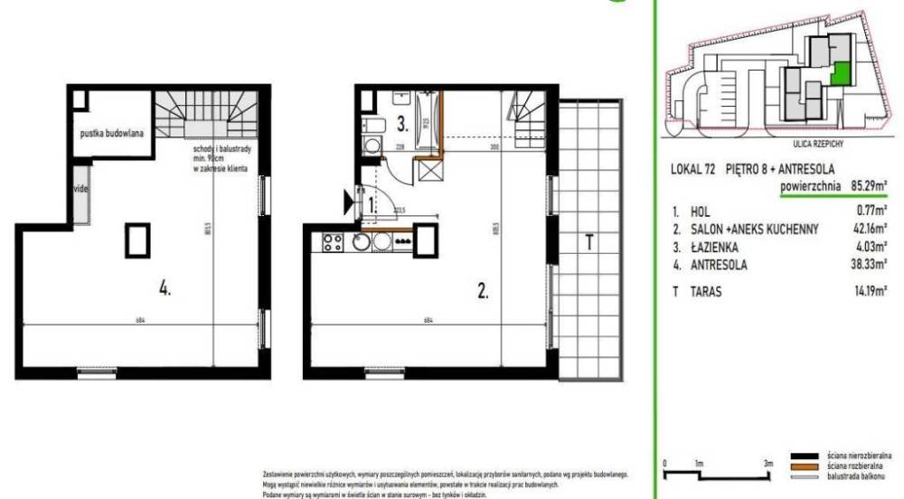 Nowoczesnemieszkanie z antresolą 85,49 m i tarasem 14,19 m - 8. piętro- Targówek, ul. Rzepichy. Cena: 1 194 551 zł Bezpośredniood dewelopera. Na sprzedaż wyjątkowe mieszkanie z antresolą o łącznej powierzchni 85,49 m oraz przestronnym tarasem o powierzchni 14,19 m, zlokalizowane na ostatnim,8. piętrze nowoczesnego budynku z windą przy ul. Rzepichy na warszawskim Targówku. To idealna propozycja dla osób szukających przestrzeni z potencjałem aranżacyjnym - wysokie sufity, otwarta przestrzeń i antresola tworzą niepowtarzalny klimat miejskiego loftu, a taras staje się naturalnym przedłużeniem strefy dziennej - idealnym na relaks czy spotkania przy kawie. Inwestycja: Nowoczesna inwestycja powstająca na Targówku to idealna propozycja dla osób szukających wygodnego mieszkania w doskonałej lokalizacji. Starannie zaprojektowany budynek o nowoczesnym wzornictwie to idealne miejsce dla rodzin z dziećmi, singli, młodych małżeństw czy osób starszych. W otoczeniu terenów zielonych i pełnej miejskiej infrastruktury, mieszkańcy mogą odetchnąć od zgiełku miasta w kameralnym zakątku starej części dzielnicy. Inwestycja obejmuje 8-piętrowy budynek z 78 mieszkaniami 1-, 2-,3- i 4-pokojowymi o powierzchni od 40 do 130 m, z głębokimi balkonami, przestronnymi tarasami i dużymi ogródkami. Do dyspozycji mieszkańców: - Miejsca postojowe w garażach podziemnych i naziemnych - Boksy rowerowe - Urokliwa strefa rekreacji na patio - Szlachetne materiały wykończeniowe w częściach wspólnych Szczegóły mieszkania: - Powierzchnia całkowita: 85,49 m - Poziom: 8. piętro (z windą) - Antresola z możliwością dowolnej aranżacji (np. sypialnia, biuro, strefa relaksu) - Taras o powierzchni 14,19 m - z pięknym widokiem i dużą prywatnością - Mieszkanie w stanie deweloperskim - Komórka lokatorska - Miejsce postojowe w garażu podziemnym Lokalizacja - Targówek, ul.Rzepichy: Świetnie skomunikowana lokalizacja z dostępem do pełnej infrastruktury: - 3 min pieszo do sklepu osiedlowego i psiego parku - 6 min pieszo do pętli autobusowej - 11 min pieszo do żłobka - 15 min pieszo do szkoły podstawowej i pływalni Polonez - 17 min pieszo do Atrium Targówek - 15 min pieszo do stacji metra - 20 min pieszo do Parku Bródnowskiego i Lasu Bródnowskiego - 5 min autem do trasy S8 - 16 min autem do centrum Warszawy Dlaczego warto? - Przestronny taras 14,19 m z widokiem ponad dachami miasta - Antresola i otwarta przestrzeń dają ogromne możliwości aranżacyjne - Nowoczesna inwestycja w spokojnej części Targówka Posiadamy również inne lokale w tej inwestycji. Zadzwoń i umów się na prezentację! Zamieszkaj nowocześnie, wysoko i wygodnie - z własnym tarasem, antresolą i świetnym dojazdem do centrum! Kontakt: Marek 509 165 458 Więcej ofert na stronach: kobrynski.pl, www.grewal.com.pl