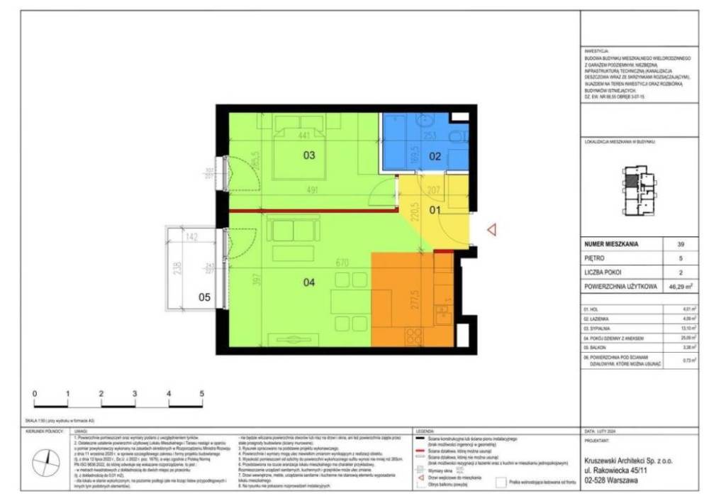 Opis ,2 pokojowe mieszkanie o pow.46,29 m2, 5 piętro | |