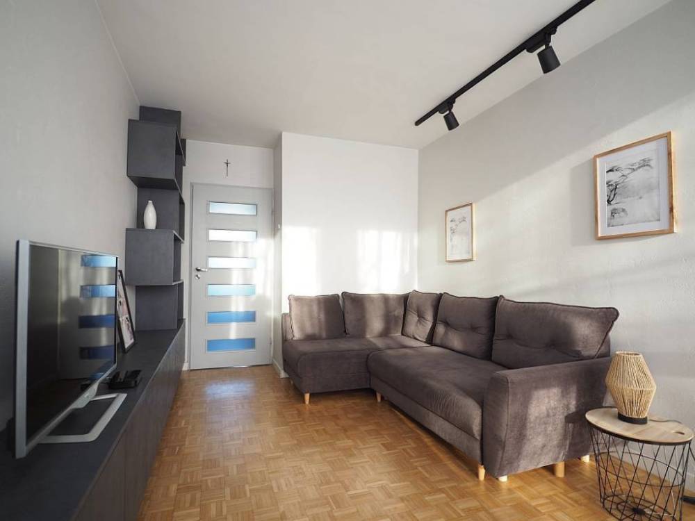 Bardzo ładnie i funkcjonalnie urządzone dwupokojowe mieszkanie z osobną kuchnią (pełen rozkład), okolice Sky Tower. NAJEMCA NIE PŁACI PROWIZJI, WYNAGRODZENIE BIURA POKRYWA WŁAŚCICIELMIESZKANIA. Mieszkanie po starannym remoncie, utrzymane w spójnej stylistyce, jasne, z dwustronną ekspozycją okien. Dwa niezależne pokoje, w każdym wygodna, rozkładana sofa z funkcją spania oraz pojemna ale wizualnie lekka zabudowa meblowa na wymiar (zamykane szafki, otwarty regał). Strukturalne wykończenie ścian, na podłogach dębowa mozaika parkietowa po renowacji. Duża szafa wnękowa w przedpokoju. Osobna kuchnia z oknem, wyposażona w meble na wymiar z pełnym AGD (gazowa płyta grzewcza, piekarnik, zmywarka, lodówka, okap) oraz rozkładany stół i krzesła. Łazienka z prysznicem, wyposażona w pralkę. Toaleta w osobnym pomieszczeniu. Mieszkanie jasne, dwustronne. Z sypialni i kuchni widok na szeroką panoramę miasta, z pokoju dziennego na drzewa i kameralny zielony skwer. Doskonała lokalizacja - budynek ok. 300 m od ul. Powstańców Śląskich (na wysokości Sky Tower), ale w trzeciej linii zabudowy, cofnięty w spokojną, cichą część osiedla. Pełna infrastruktura osiedlowa (sklepy, galerie handlowe, usługi), liczne linie tramwajowe i autobusowe, 10 minut spacerem do Dworca Głównego, 4przystanki lub pół godziny spacerem do Rynku. Blok otoczony zielenią, z nową windą, odmalowaną klatką schodową i domofonem. Pod blokiem parking ze szlabanem, wyłącznie do użytku mieszkańców. ,Do mieszkania przynależy piwnica. Ogrzewanie miejskie. ,Do czynszu najmu należy doliczyć koszty eksploatacyjne, tj. opłaty do Spółdzielni Mieszkaniowej oraz należność za energię elektryczną, gaz i internet - łącznie za wszystko 950 zł - 1150 zł, w zależności od ilości osób i faktycznego zużycia mediów. , WOLNE OD ZARAZ, klucze w biurze. Osoba prowadząca ofertę: 608 669 382. Niniejsze ogłoszenie nie stanowi oferty w rozumieniu art. 66 KC