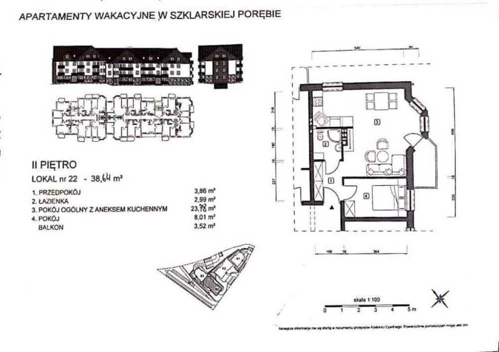 Apartamenty wakacyjne w ostatnim okresie czasu coraz więcej klientów zwraca uwagę na korzyści jakie generują tego typu nieruchomości jest to stabilna lokata kapitału , możliwość uzyskiwania stałych przychodów w przypadku wynajmu tzw krótkoterminowego , postępuje również stale wzrost cen tego typu nieruchomości w znanych kurortach turystycznych . Zaprojektowane w ramach inwestycji kameralne cztery apartamentowce A1 , A2 , B1 , B2 stylizowane na styl karkonoski odpowiadają wysokim standardom technicznym i architektonicznym , przewidywane niskie koszty utrzymania i eksploatacji . Proponuję apartament własnościowy o powierzchni 38,64 m2 położony na II piętrze w budynku B2 z widokiem na panoramę Karkonoszy od strony wschodnio południowej . W skład lokalu wchodzą : pokój ogólny z aneksem kuchennym z wyjściem na balkon , sypialnia , łazienka , przedpokój w cenie miejsce garażowe i zewnętrzne miejsce postojowe . Budynki położone w urokliwym miejscu Szklarskiej Poręby w sąsiedztwie apartamentowców i aparthotelu blisko atrakcji turystycznych miasta . Apartamentowce budowane w technologii tradycyjnej : cegła kratówka , dach dachówka betonowa , tynki gipsowe , drzwi wewnętrzne pełne tzw. typowe stolarka okienna PCV w naturalnym kolorze drzewa , balkony drewniane , ogrzewanie centralne i ciepła woda z kotłowni gazowej . Lokale oddawane do wykończenia indywidualnego bez białego montażu , istnieje możliwość wykończenia lokalu pod tzw. klucz . 2. Balkon - 10 000 zł brutto 3. Miejsce postojowe zewnętrzne - 20 000 zł brutto . 4. Miejsce garażowe - 40 000 zł brutto . W ofercie również apartamenty dwu-pokojowe pow. 32 m2 . W celu bliższych informacji zapraszam do kontaktu . Tel. 514 209 936 .